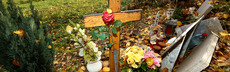 Die flackernden Grablichter zeugen auch davon, dass hier jemand regelmäßig vorbeikommt, um die Erinnerung wach zu halten.