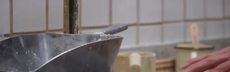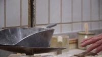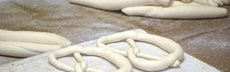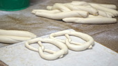 Der Bäckermeister rollt den Teig zu einer Schlange aus. Die packt er an den Enden und schleudert sie mit einer leichten Drehung aus dem Handgelenk durch die Luft. Wenn der Teig wieder auf dem Brett liegt, hat er die fertige Brezelform.
